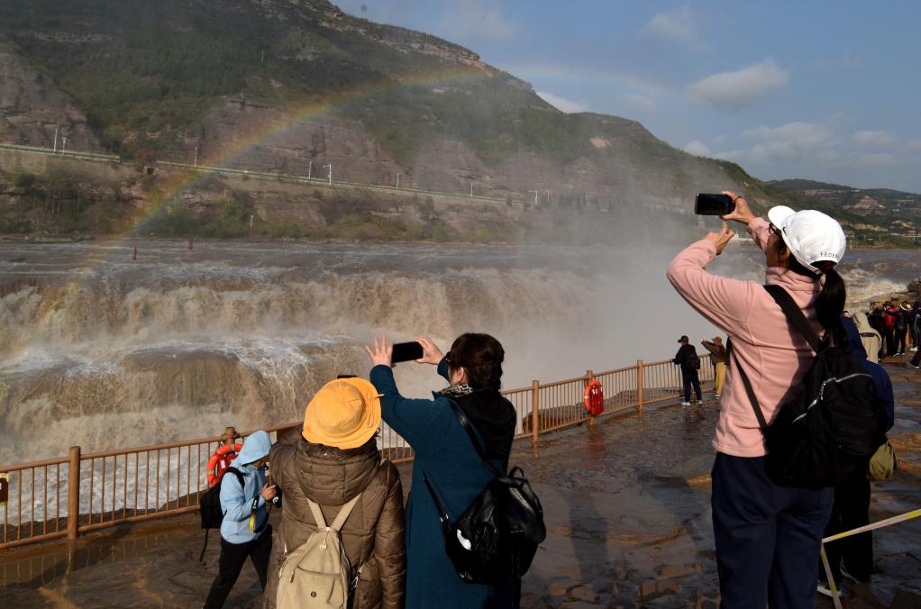 新華社照片,吉縣(山西),2025年10月27日 10月27日,游客在山西吉縣黃河壺口瀑布景區欣賞“彩虹橋”景觀。 壺口瀑布“彩虹橋”